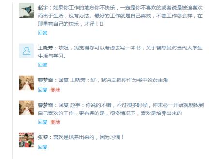 从《“友谊”易班》进行了半年的情况看,其对大学生的网络思政教育有着显著的影响力,曹老师发布的博文经常受到学生的点赞,曹老师也会认真回复每一个有疑问的学生,做好和学生的直接对话。