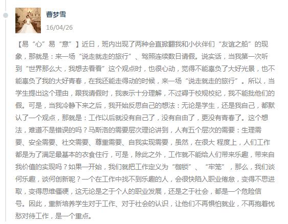 图为曹梦雪老师发布的博文和与学生的互动截图