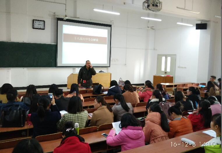本网讯(通讯员 周芳 钱琪)12月8日下午,外国语学院邀请思政课部教师李辉为全体教师和学生党员进行学习贯彻党的十八届六中全会精神宣讲活动。