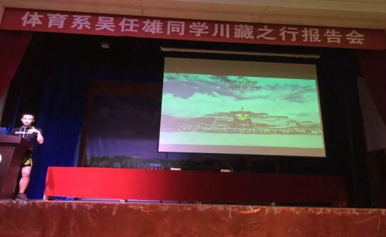 本网讯(通讯员 李蕊希 卢旻)近日,体育系举行吴任雄同学川藏之行报告会。吴任雄同学三十天骑行三千多公里,完成了他的川藏之行。就如他的自我介绍,我叫吴任雄,英雄的雄。三十天风雨兼程,六千里艰难苦困,他没有产生一丝退意,总是坚定不移的继续前行。
