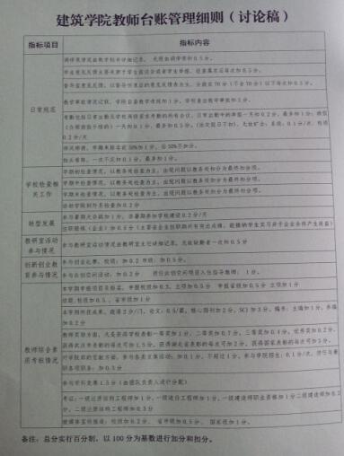 该教师工作台账小册经过学院全体教师多次讨论,主要对教师日常规范、学校检查相关工作、转型发展、创新教育参与情况、教师综合素质考核情况六个指标进行记录,每个指标都有具体的内容和相对应的分数,在教研室验证考察后,作为年终综合考评的依据。