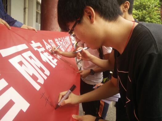 2015级学生党支部书记淳再清老师带领全体党员来到学生集中宿舍——学子南,和宿管员一起拉起“心美言丽宿舍留德行礼让文明求”的横幅。学生纷纷在上面签名,表示首先从自身做起,同时用行动感召更多的同学养成良好的生活习惯,共同打造特色文明寝室。