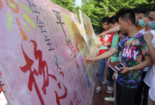 据了解,大赛由校团委主办,校学生会承办。各院系代表队先通过抽签方式确定“社会主义核心价值观”中的一个词作为其创作主题。5月6日下午,各院系代表队在晨光湖广场进行现场集中创作。5月9日-11日,宣传板在文化长廊进行展示。5月11日下午,在图书馆广场举行现场评比,学生处、宣传部、校团委和艺术系教师代表担任大赛评委。宣传板设计者分别就宣传板设计理念和创作内容进行3分钟讲解,讲解员个个精神饱满,他们从不同角度阐释宣传板的内容和自己对“社会主义核心价值观”的理解,赢得现场热烈掌声和网络平台一片点赞。