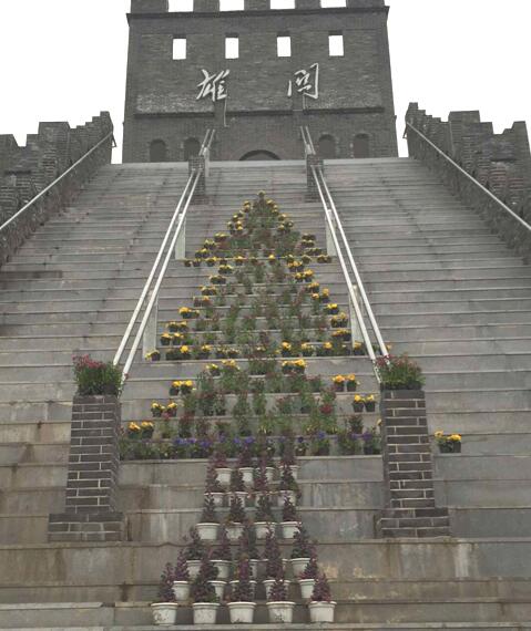 经过老师的指导配色,同学们选择了羽衣甘蓝、三色堇、石柱等颜色鲜艳的观赏植物来装扮长城,这些植物都是园林系的师生自行种植及管理的,每一盆植物都经过了细心的呵护。大家将不同的植物按规则配列起来,组成了一棵“树”的形状,进一步增添了长城雄关的庄严美丽,更加令人赏心悦目。