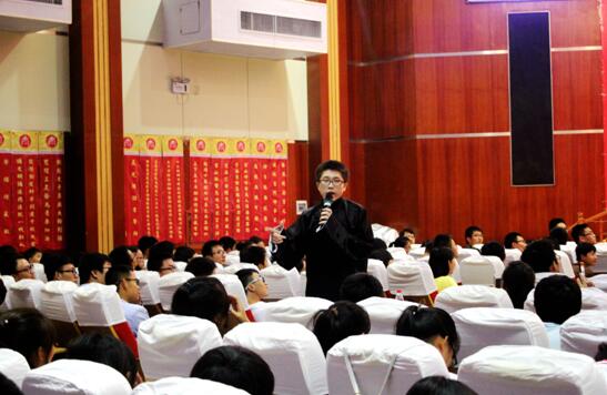 晚会进行过程中,轮到李华炜表演,只见他身着一袭黑色大褂,兴冲冲地走到观众中间,充满激情和幽默地表演起单口相声,滔滔不绝地给易班做起了“广告”,他将易班的基本功能、使用方法与大学生日常生活紧密联系,用新鲜生动的实例调动起新生对易班的兴趣,在新生还未真正接触到易班之前便先声夺人,为随后在新生中推广易班作了一个很好的铺垫。