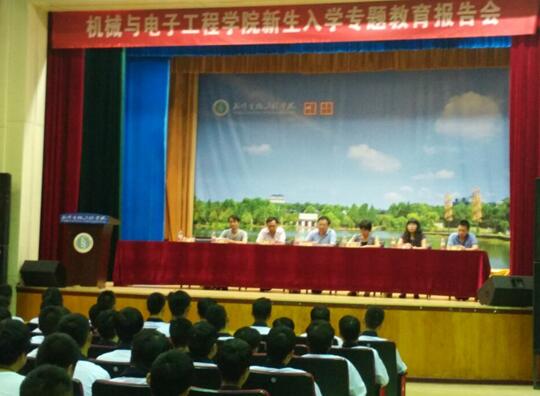 副校长、机电学院院长侯祖飞教授接着介绍了学院的基本情况,重点讲解了专业学习与发展前景,他鼓励新生要有自信,要脚踏实地,要自强不息,在学习中不断完善自我。