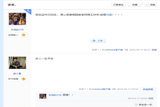 本网讯(通讯员 王静 于朝刚)“钱包证件已经收到,真心感谢柳园食堂王林利阿姨和刘超经理!”昨晚,在武生院贴吧里,一位网名“乐观的大马”的同学这样写道。