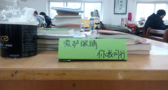食品系青协主席范金洁说道:我爱看书,但一个好的看书环境可以让我们的心情更愉悦,更爱学习,我们今天所做的就是想为大家营造良好的学习环境。她带领大家用彩纸做成标签摆上每个桌子。“视界之美,你我之魅”,“爱护眼睛,你我同行”,等等,不仅为自习室增添了一抹亮丽的光彩,更让前来看书学习的同学们心中涌起层层暖意。