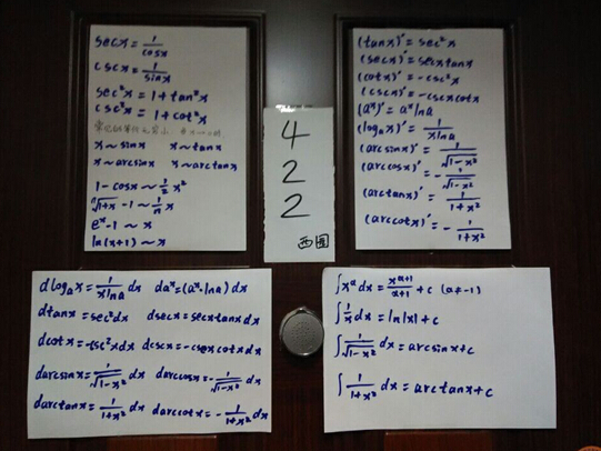 这种方法一提出,西园422宿舍成员便立即行动起来,并且很快见到效果。吴刘文同学说:“以前学习高数时感觉挺困难的,有时做题公式忘了,翻几遍书找不到,就放弃了。现在在门上贴上公式表后,每次公式忘了可以直接去看表,方便又快捷,每天出门时看几眼,回来后又看几眼,几天就把公式记熟了。我们以后决定将其他课程的要点也做成纸条贴上,争取做出更好的成绩。”