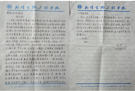 周小芳因其16岁弟弟今年7月被查出患有急性髓系白血病M2,在面对巨额医疗费茫然无措时,母校得知后,由杨子威献血捐髓志愿服务队、一缕阳光爱心接力社、管理学院青协、校学生会、社联等学生组织开展了爱心义演、募捐等活动,许多师生也都纷纷解囊相助。她深深感受到了校领导、老师、同学无比温暖的关爱,禁不住用感谢信的方式表达自己及家人的真挚谢意。