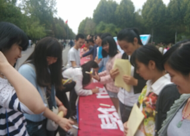 本网讯(绿洲文学社 彭泽林)9月29日中午,我校图书馆广场前的晨光路旁人头攒动,热闹非凡,形成了一道长长的人墙。走进现场笔者观察到,原来是同学们纷纷结伴在一条名为“争做好室友,创建和谐校园”的横幅上签名。