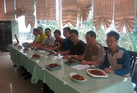 考核分厨艺技能考核和业务理论答辩两个环节。下午三点,厨艺技能考核在接待中心举行,每名厨师用指定的食材,限时制作两道家常菜——鱼香肉丝和红烧鱼块。膳食管理中心、后勤集团办公室及五个餐厅的经理组成的评审团通过观、闻、尝对每道菜的“色、香、味、形”进行了评分。