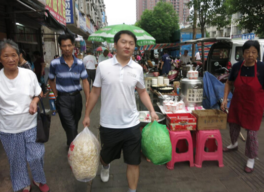 别若峰提着30斤的豆芽在攒动的人群中矫健前行