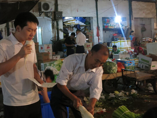 8月11日清晨,笔者随同配送中心两位同志前往阳逻平江集贸批发市场采买接待中心、南园餐厅日常物资,体验了一把配送员的早班生活。