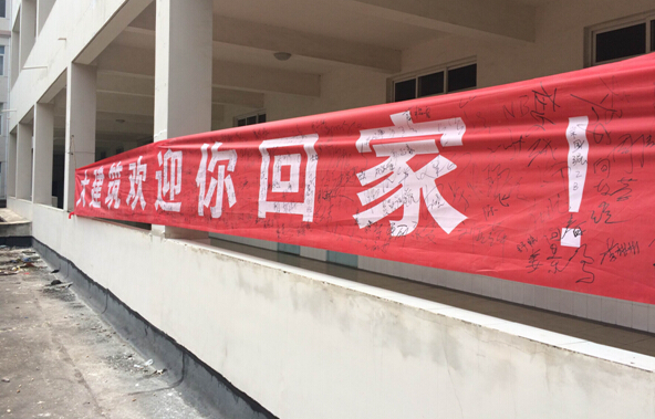 一进1号教学楼,“大建筑欢迎你回家”的横幅十分醒目,不少学生举大拇指直称“霸气”。记者看到,该横幅长约10米,上面写满了建筑系师生的签名,这是该系为了欢迎毕业生常回母校看看而特地制作的。系分团委书记席亚健说:“全系师生在横幅上签名,就是期望毕业生常回学校看看,常回系里看看,常和系里老师及学弟学妹们拉拉家常,为学校的发展和系里的建设共谋良策。”