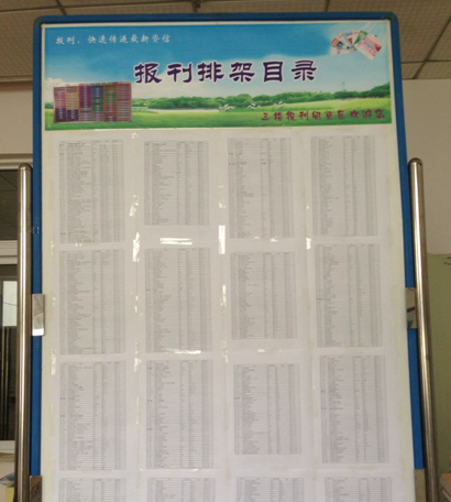 本网讯(通讯员 董群花)走进学校图书馆大门,大厅新增了一块宣传板——《报刊排架目录》。她就是图书馆报刊阅览区为方便读者查询自己喜欢的报纸和期刊推出的又一个性化服务项目。