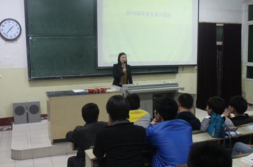 在掌声中,朱丹丹老师走上讲台,为同学们详尽的介绍了该系2010级学生参加实习实训的总体情况,分析了实习实训过程中遇到的困难与原因,阐述了实习实训的重要作用和意义。最后她指出,实习实训是学校教学环节中的重要内容,旨在帮助同学们适应企业运行模式,了解企业用人标准与要求,从而顺利实现从学生向员工的过渡与转变,在这个过程中大家也可以通过实习实训来选择和确立自己未来的发展方向。她还提到,实习实训过程中环境的变化和生活、学习模式的改变可能会从心理上带来冲击及诸多挑战,这种变化在带来不适的同时也为大家提供了磨练意志的机会,可以有效的调整心理状态,找到正确的心理定位,对于大家的成长与发展十分重要。