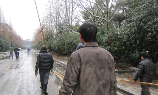后勤集团的员工们手持4米至7米长的木杆如火如荼的干起来,有人打湿鞋子,有人淋湿头发和衣服,但大家却丝毫感觉不到冷意。经过数小时的努力,被打理过的树枝终于迎风飘扬。