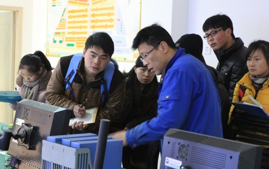 上午10:30,中控室黄主任正在为师生讲解设备的运行情况