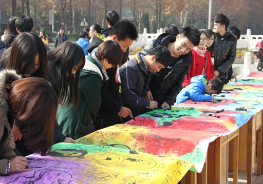 本网讯(通讯员 宋颖颖)12月10日上午,“洗脸——艺术系2013级视觉传达创意互动展”在图书馆前进行。2013级视觉传达设计班的全体同学作为创作者,在11米的长卷上绘出了自己的图形创意构思。他们以人们所熟知的白雪公主、哆啦A梦等人物形象为载体,融入自己的想象和概念进行现场再创作。
