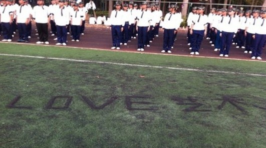 与教官离别前,艺术系2013级新生们收到一份来自现场的特殊礼物——“LOVE艺术”。礼物出自54连的教官张传仁,张教官在自己的微博里写道:“也许她们还无法明白军训的意义,但她们已经为军训付出了太多;也许她们无法实现军训时的梦想,但她们已经为军训流下了泪水。而我能做的,仅仅是努力地认真地教好每一个动作、每一个细节,整齐划一,绝不放弃!送给艺术系的同学们,希望你们像爱艺术一样爱生活!”