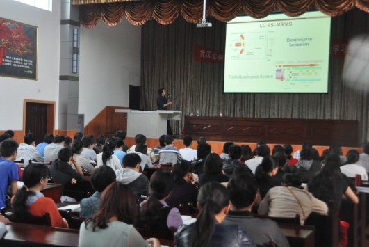 本网讯(通讯员 周晚霞 大学生记者团 柏杨)9月26日下午4点20分,美国德克萨斯州立化学研究院副研究员李玮博士做客我校晨光讲坛,在钱学森报告厅作了题为《液质联用在生物分析中的应用》的报告。生物科技系主任李毅教授及化学与环境工程系和生物科技系百余名师生参会。报告会由化学与环境工程系主任甘复兴教授主持。