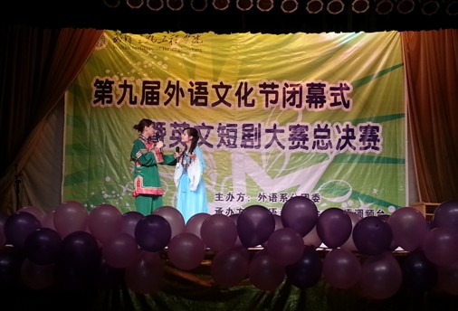 本网讯(通讯员 吴佳琪)为激发学生英语学习兴趣,提高运用能力, 5月30日晚,由外语系主办,外语系学生会、英语调频台承办的第九届外语文化节闭幕式暨英文短剧大赛总决赛在小礼堂举行。选手们用英文重新演绎了《孔雀东南飞》,《新白娘子传奇》、《西游记》等经典著作。最终,管理工程系2011级市场营销本科2班、外语系2012级商务英语1班、制药工程系2012级中药1班分别获得本次大赛的前三名。