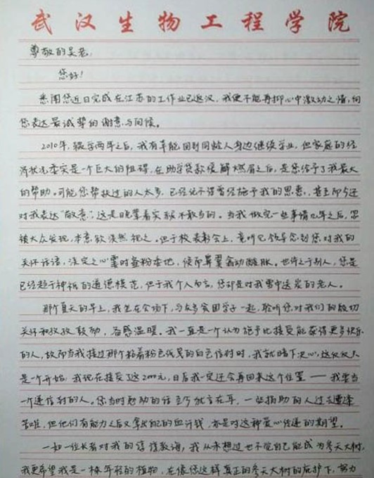程菲同学写给全国道德模范吴天祥的感恩信