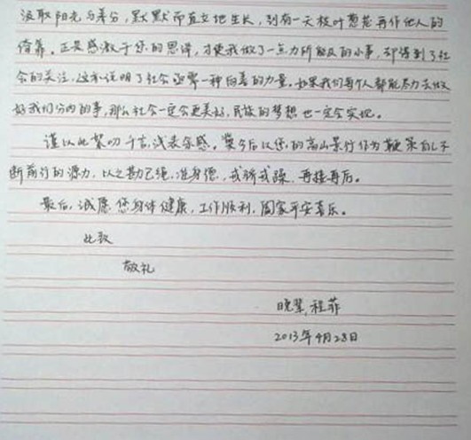 那个夏天的早上,我坐在会场下,与众多贫困学子一起聆听您对我们的殷切关怀和孜孜鼓励,倍感温暖。我一直是一个认为施予比接受能获得更多快乐的人,故而当我接过那个粘着粉色纸笺的白色信封时,我就暗下决心,这仅仅只是一个开始,我现在接受了这2000元,日后我一定还会再回来这个位置——我要当一个递信封的人。您当时勉励的话至今犹言在耳,一些捐助的人过去遭逢苦难,但他们有能力之后,又拿出自己的血汗钱,亦是对这种爱心传递的期望。