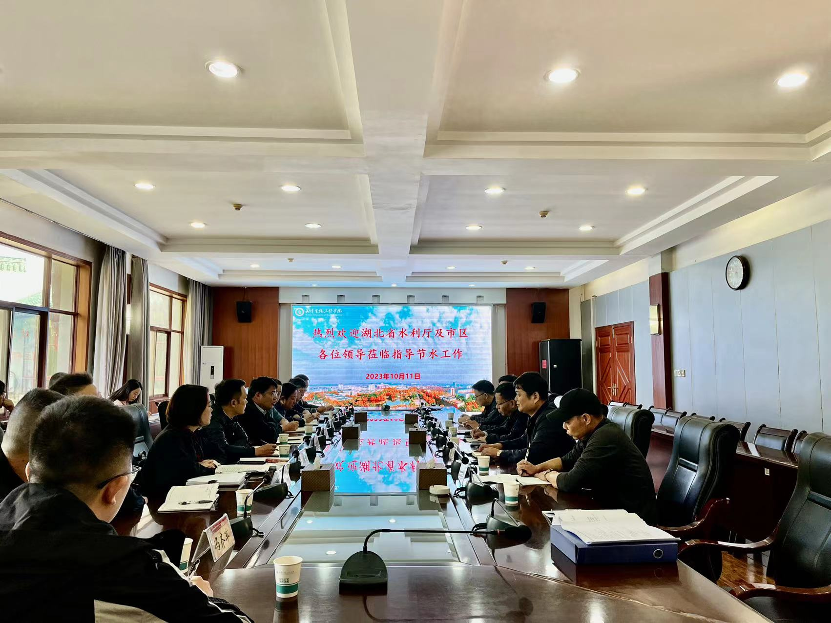 本网讯(通讯员 张婷 卢永俊)10月11日上午,湖北省水利厅节水处(省节约用水办公室)副处长汪小龙、省水文水资源监测中心主任皮向东,武汉市节水办主任王雄辉、新洲区水务和湖泊局副局长徐文杰等一行来校调研计划用水管理、节水型高校创建和推进合同节水管理等情况。调研座谈会在学术交流中心西湖厅召开,副校长邱建洲,常电股份学校管理人员、后勤集团及水电管理与综合服务中心负责人等相关人员参加会议,会议由后勤集团总经理彭军主持。