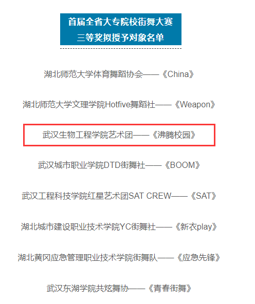 本网讯(通讯员 江晨曦)近日,湖北省青年联合会发布首届全省大专院校街舞大赛获奖名单,经过激烈的角逐,我校艺术团参赛作品《沸腾校园》荣获三等奖。