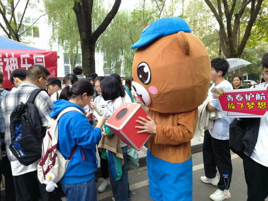 当天是第三十二个世界精神卫生日。全国宣传主题为“促进儿童心理健康,共同守护美好未来”。为进一步加强心理健康知识普及,传递健康教育理念,青春护航学院发起了“关注心理健康 共筑精神乐园”快闪活动。一曲欢快的舞蹈结束后,身着玩偶服的志愿者捧出一个心理健康知识有奖竞答箱让来往同学抽取。现场同学们积极参与答题,开展互动交流,了解相关知识,增强心理保健意识。青春护航学院还向同学们发放了心理健康知识宣传手册和印有心理咨询预约渠道的笔袋、扇子等纪念品。