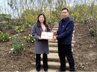 邱建洲与边碧雯校友为“欧洲月季园”揭牌,并为边碧雯校友颁发捐赠证书。