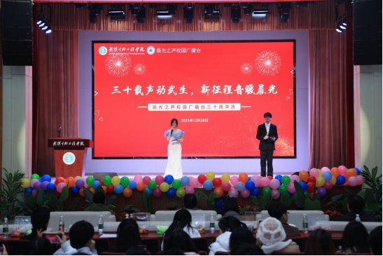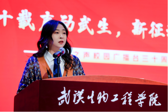 党委宣传部部长、融媒体中心主任程晓璐作为校广播台指导老师深情致辞。她表示,三十年来,广播台不仅成为武汉生物工程学院的“声音名片”,更是师生精神家园的守护者,始终以真诚的声音陪伴青春、记录时代。从传统播音室到现代融媒体平台,变的是技术与形式,不变的是对真与美的追求、对校训精神的践行以及用声音凝聚共识的初心。她强调,今天的庆典是一次温暖的回家,更是一场使命的接力——愿“晨光之声”永葆青春活力,在新时代继续以声传情、以声载道,让武生院的故事声声不息、代代相传。