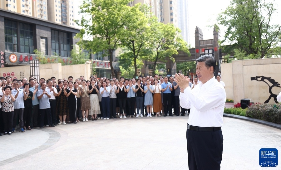 6月28日,中共中央总书记、国家主席、中央军委主席习近平在湖北省武汉市考察。这是28日下午,习近平在东湖高新区左岭街道智苑社区广场同干部群众亲切交流。新华社记者 李涛 摄