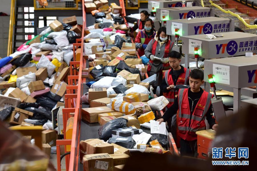 2020年11月3日,在位于贵州省龙里县的贵州快递物流园圆通速递贵州分拨中心,工作人员分拣货件。新华社发(龙毅 摄)