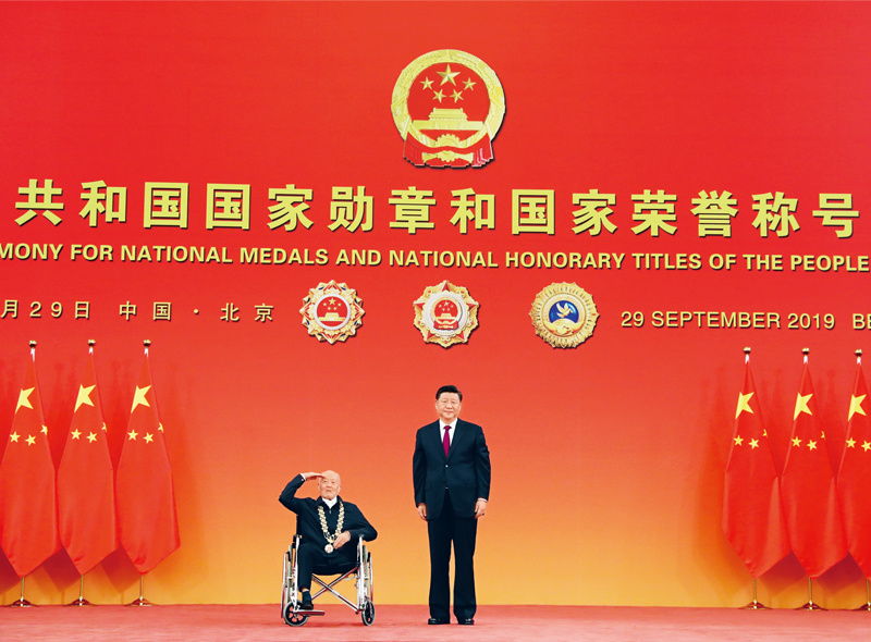 2019年9月29日,中华人民共和国国家勋章和国家荣誉称号颁授仪式在北京人民大会堂金色大厅隆重举行。中共中央总书记、国家主席、中央军委主席习近平向“共和国勋章”获得者张富清颁授勋章。 新华社记者 王晔/摄