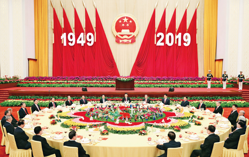 2019年9月30日晚,庆祝中华人民共和国成立70周年招待会在北京人民大会堂隆重举行。习近平、李克强、栗战书、汪洋、王沪宁、赵乐际、韩正、王岐山等党和国家领导人与4000余名中外人士欢聚一堂,共庆新中国70华诞。 新华社记者 黄敬文/摄