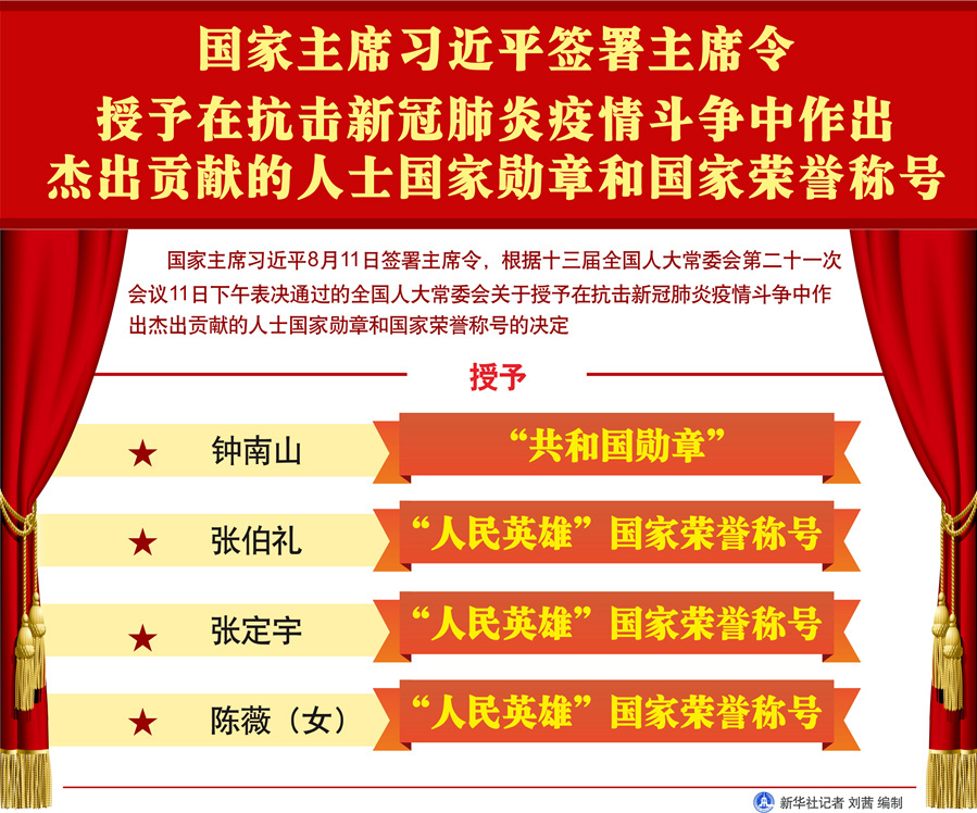 新华社北京8月11日电 国家主席习近平11日签署主席令,根据十三届全国人大常委会第二十一次会议11日下午表决通过的全国人大常委会关于授予在抗击新冠肺炎疫情斗争中作出杰出贡献的人士国家勋章和国家荣誉称号的决定,授予钟南山“共和国勋章”,授予张伯礼、张定宇、陈薇(女)“人民英雄”国家荣誉称号。