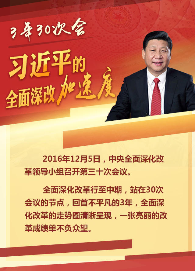 2016年12月5日,中央全面深化改革领导小组召开第三十次会议。全面深化改革启动3年来,在习近平总书记直接领导下,中央深改组的30次会议,牢牢把握改革正确方向,及时提出阶段性任务目标,着眼全局性重大问题进行顶层设计,审议通过198份改革文件,狠抓改革举措落地,直面问题点穴开方……