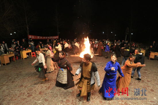 2月26日晚,该校藏汉大学生在晨光湖畔举行篝火晚会,共同跳起弦子舞,欢庆藏历新年。