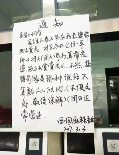 由于承包的学校香辣锅生意火爆,侯高红平时没时间回家,一到放假,相亲就频繁。“由于食堂管理严格,除寒暑假外,要暂停营业,必须请假,并在档口上贴通知”。然而,侯高红中秋相亲失败,还得继续相亲,之后又结婚生子,于是就有了2015年圣诞节、去年10月底,今年3月初的那3张停业通知单。“停不下来啊,相亲成功后,事儿就多了”。