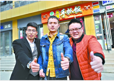 张培文、哈胜玺、陈金磊(右起)在新疆手抓饭店铺门前合影 记者李永刚 摄