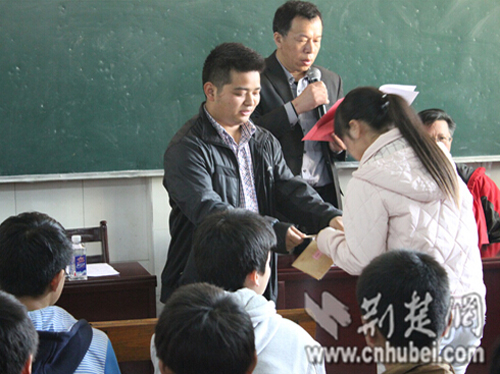 武生院生命科学与技术学院院长李毅教授也是第二次来到刘河中学见证“一缕阳光”的公益捐赠,他由衷为骆群曙坚持公益感到欣慰和骄傲,“如今,全中国都知道武生院有位‘爱心小胖’,他满满的正能量让整个社会都为之鼓舞”。他希望受资助的同学不要因为家境困难而放弃梦想,要树立远大的目标,努力学习科学知识,同时也要学会感恩,感谢父母,感谢给予帮助的人,感谢社会。