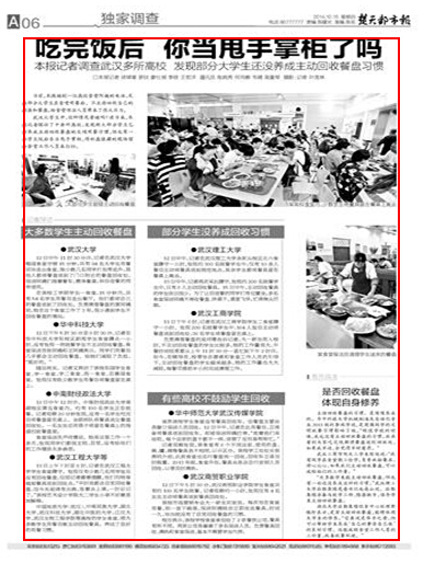 中国地质大学(武汉)、中南民族大学、湖北大学、武汉科技大学、湖北中医药大学、江汉大学、武汉生物工程学院等高校的学生食堂,绝大多数学生用餐后能主动回收餐具,养成了良好的用餐习惯。
