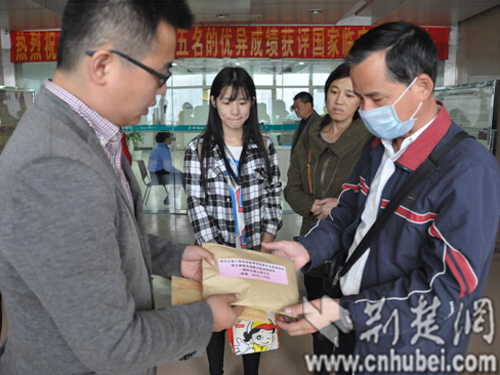 荆楚网消息(通讯员 任丽琼 陈莹)10月21日,武汉生物工程学院“杨子威献血捐髓志愿者服务队”“一缕阳光爱心接力社”的学生代表们,将募集来的共计42187.7元善款送到了武汉协和医院。身患白血病16岁少年周方正的父母接过尚有余温的捐款时,泪水禁不住在眼眶里打转,感激之情溢于言表。