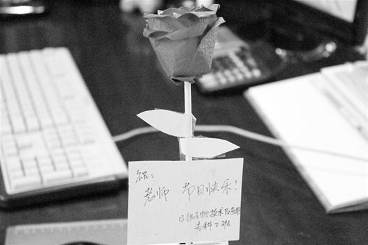 楚天金报讯 昨日早上,武汉生物工程学院生命科学与技术学院的姜老师收到了一朵“玫瑰花”,花中还附一张卡片:“祝老师节日快乐!”走近一看才知,这朵玫瑰花是以一次性筷子和环保纸折成,成本不到8分钱。该学院学生说:“同学们想趁教师节表达感激之情,决定一起为老师折一朵纸玫瑰。”