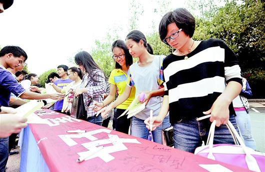 湖北日报讯 图为:昨日,大学生在“争做好室友,传递正能量”的横幅上踊跃签名。(记者 孙文 摄)
