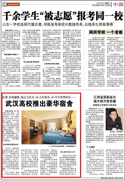 7月23日,该校在招生信息网上发布“2014级新生住房意向调查问卷”后,“即将推出的二人间究竟什么样”成了不少新老学子和家长关注的焦点。8月3日,应学生和家长的要求,该校在官方微博上发布了二人间样板间效果图,其三星级标间般的学生寝室,让不少网友惊羡不已。