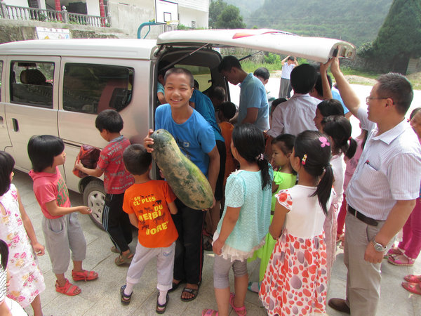 7月10日,团县委副书记徐蕾,团县委办公室主任、县志愿者协会会长张林等一行来到黄赵小学,为志愿者送去瓜果蔬菜,来到教室观看李志愿者现场教学,教室里传来清朗而响亮的读书声。